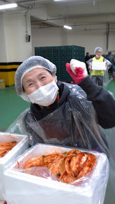 I was corrected a few times because my kimchi skills are not so good.  I even got kicked out of my spot for a while because the Mayor of Seoul came to do a photo op of him making kimchi.  Apparently I wasn't putting enough sauce in there or something, because sometimes after I put it into the box, someone would pull it out and add some extra secret sauce.  But towards the end of the project, when we were wondering if it was ever going to end, either my skills got better or their standards got lower, because they just let it be!