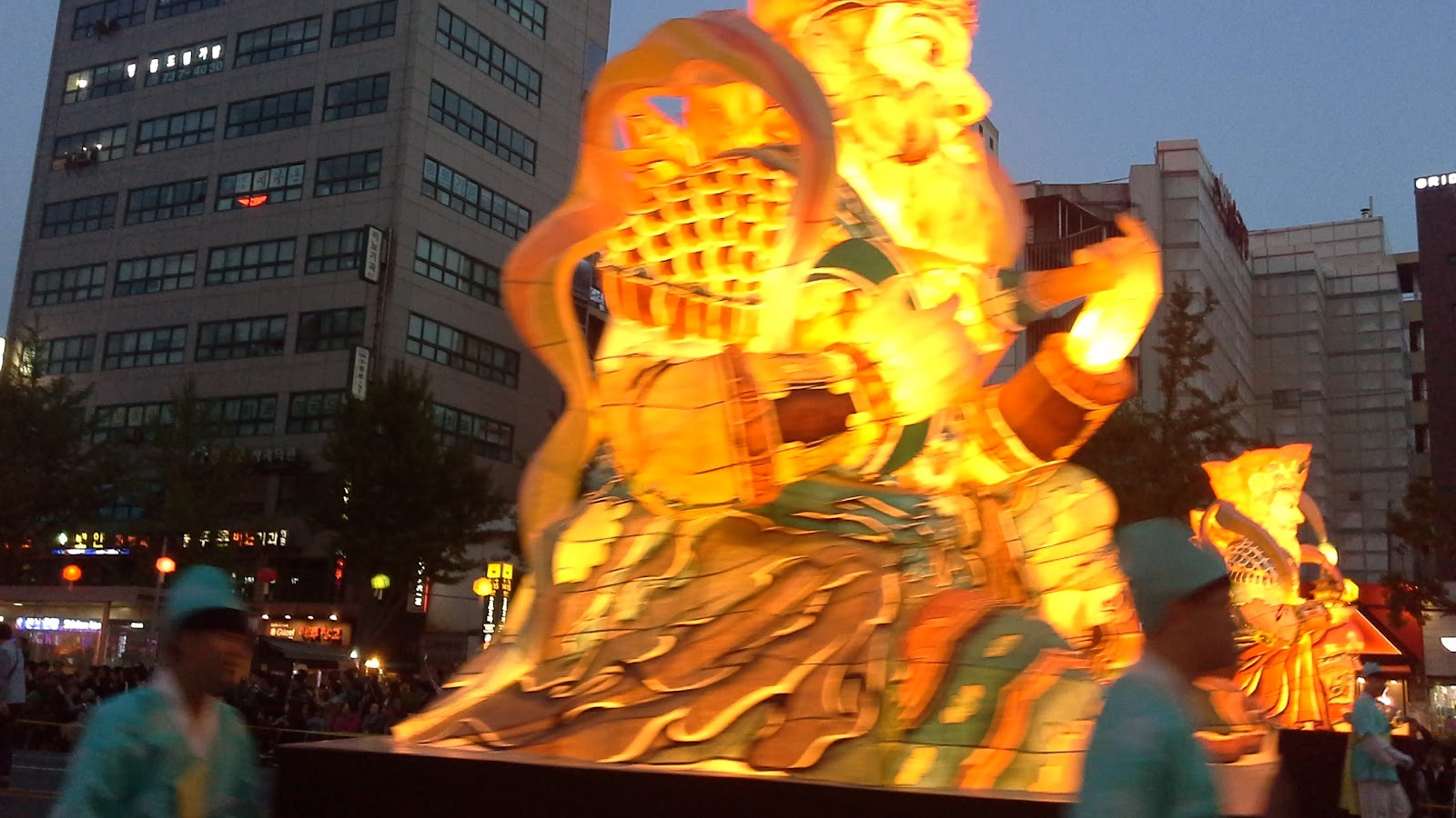 On Saturday night there was a parade for the Seoul Lotus Festival. It is commemorating Buddah's birthday which is May 3. Thousands of people are in the parade carrying lanterns or playing music or pushing floats.
